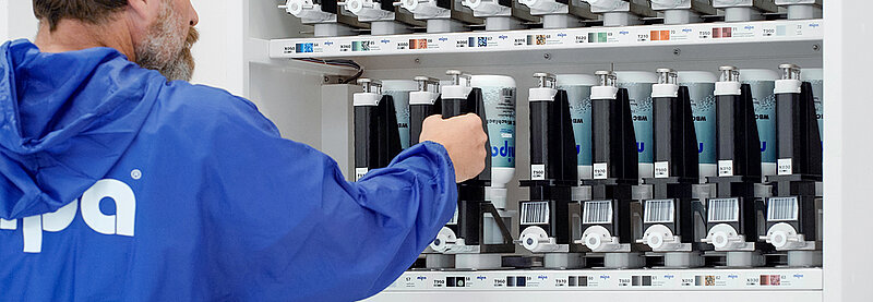 Al centro dell'attenzione ci sono due macchine miscelatrici automatizzate di ultima generazione: la macchina miscelatrice completamente automatica Mipa Abtönautomat CR 6 e la macchina semiautomatica Mipa Sunrace. Entrambe le apparecchiature consentono miscelazioni di colori riproducibili con la massima efficienza, alta velocità e la migliore facilità d'uso.
