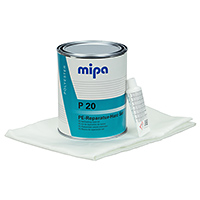 Resina poliestere per riparazioni, incl. catalizzatore e tessuto di vetro.